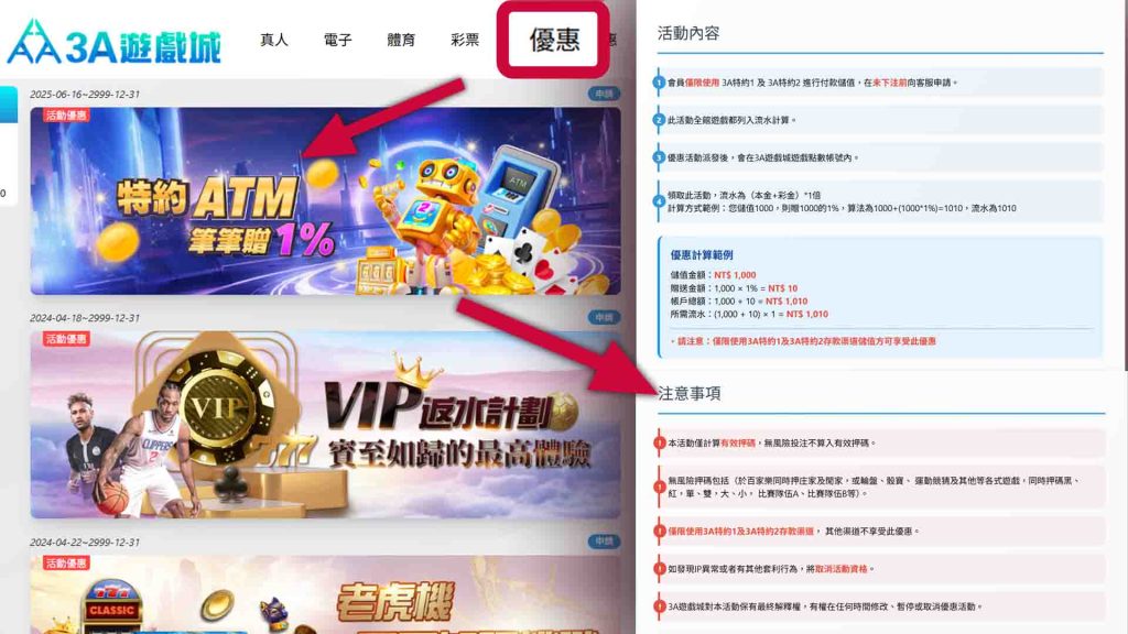 ☝ 第二步,進入 3A娛樂城的「活動專區」,這裡會列出目前可參加的所有活動,包括活動期限、條件與彩金內容。