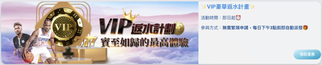 這項返水優惠讓你「玩愈多、領愈多」,無論你投注的是體育、真人娛樂還是電子遊戲,只要有下注紀錄,就能在隔日自動領取返水金,完全無需繁瑣申請,讓回饋更即時、更輕鬆!
